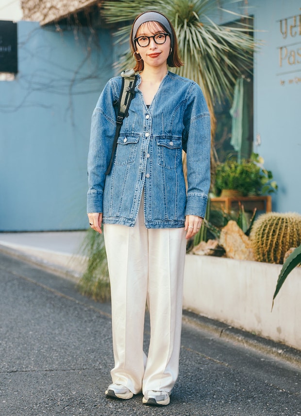 春らしいペールイエローのデニムジャケットがお似合いのヒトミさん。ボトムはラフなスウェット、足元は黒のローファーを合わせて旬なミックスコーデに。ボリュームの出やすいボトムに短丈ジャケットを合わせることで、すっきり見えを叶えてくれるバランスのいいスタイリングが完成。