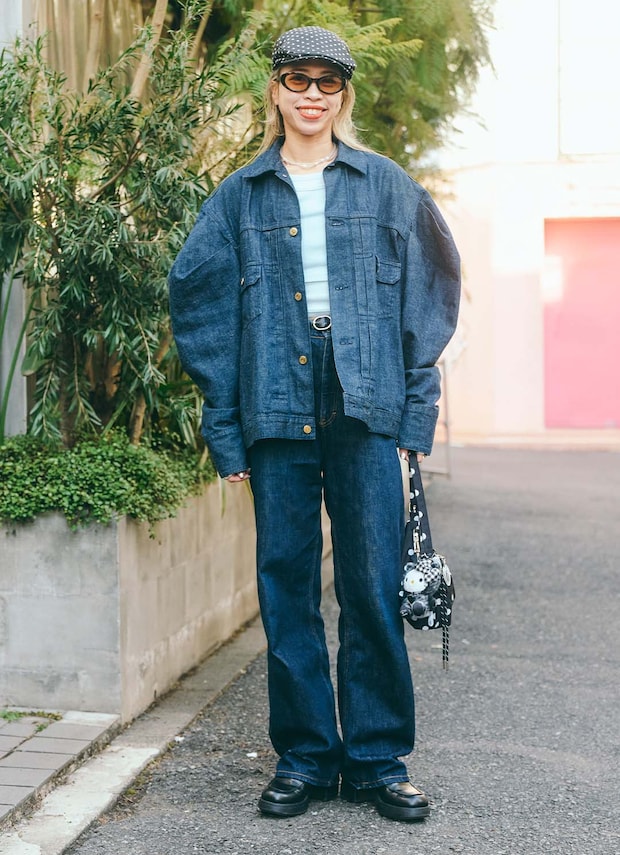 難易度高めのデニムONデニムを披露してくれたshihokoさん。ボリュームのあるパフスリーブがポイントのジャケットと、美シルエットのボトムは『ホリデイ』のもの。ドット柄のハンチングハットやバッグにつけたチャームがアクセントになって、ハンサムななかにもチャーミングさを忘れない大人の余裕を感じる装い。