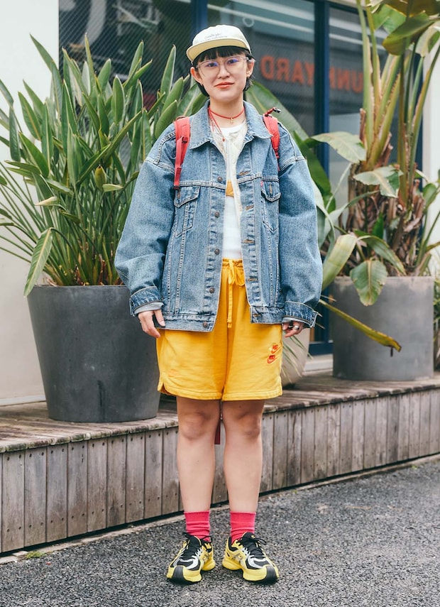 こなれ感たっぷりな『リーバイス』のデニムジャケットに『ナイキ』のハーフパンツを合わせてスポーツミックスを楽しむrikoさん。インナーには、キルティングアウターやトップス、ブラトップをレイヤードしてさりげなく奥行きのある仕上がりに。靴下とバックパックを赤で揃えればまとまり感もアップ。