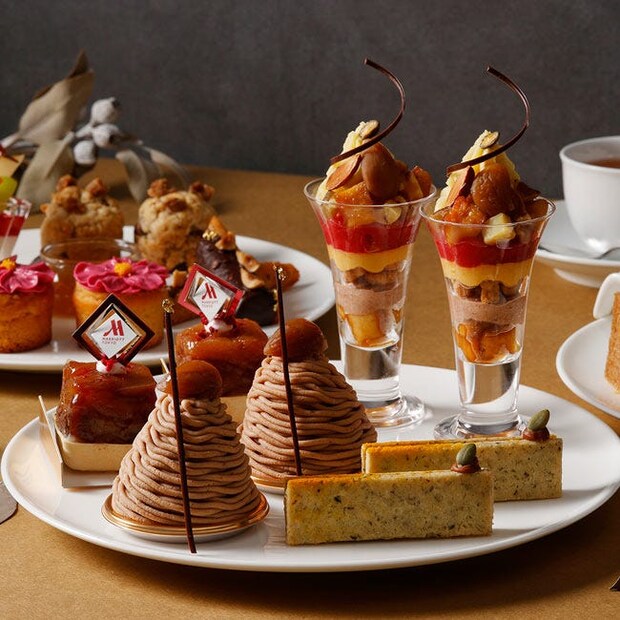 注目のモンブランは、「プリンさつまいもモンブラン」と「紫芋モンブラン」、「パイ生地のモンブラン」の3種類を用意。このほかにも、タルトにムースなどの多彩なスイーツや、季節のセイボリー、ほっと落ち着く味わいの「マロンポタージュ」など、秋らしい逸品の数々を堪能できる。また、乾杯のロゼスパークリングワインに加え、「TWG tea」の紅茶がフリースタイルでいただけるのもうれしい。