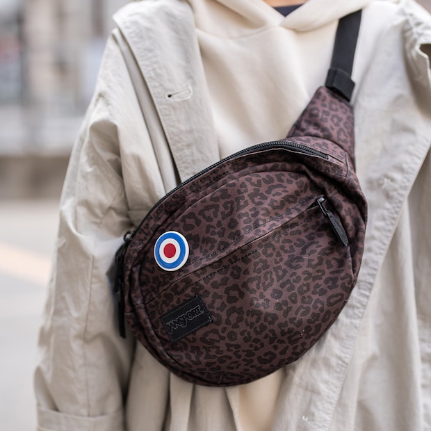 レオパード柄のウエストバッグでスパイスをひとふり。ターゲットマークのピンバッジもこだわりポイント。