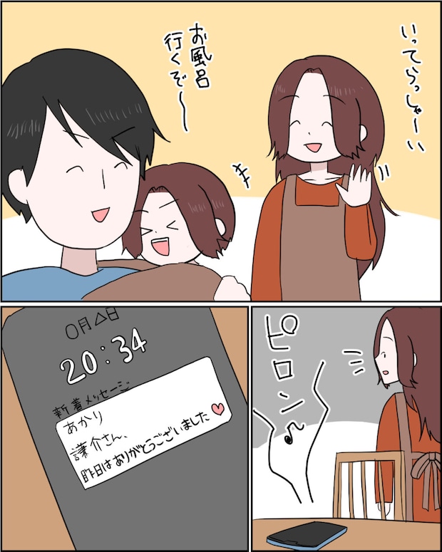 そんなある日、謙介が瑠衣をお風呂に入れてくれているときに謙介のスマホにメッセージが届いたことに気づいて何気なく画面を見た私は思わずスマホを取り上げました。『謙介さん、昨日はありがとうございました』とハートマーク付きのメッセージが見えたからです。