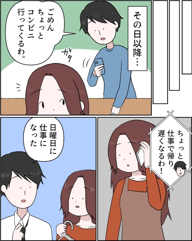 それからというもの、謙介の行動が少しずつ変わってきました。しょっしゅうスマホを見ているし、かと思うと急にコンビニへと言ってでかけたり、仕事で遅くなったり週末にも仕事があるといって家を空けることが増えてきたのです。