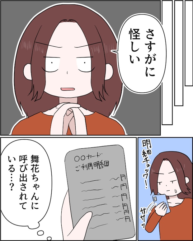 さすがに怪しいと思った私がクレジットカードの明細をチェックすると、謙介が使ったと思われる買い物がずらりと並んでいました。舞花ちゃんに呼び出されているのかなとまたモヤモヤを募らせた私です。