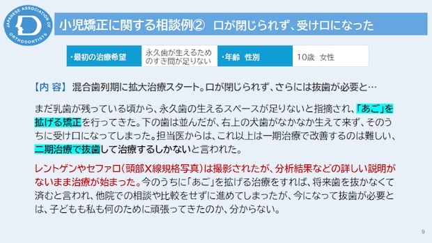セミナーでは、拡大装置を使った治療に関する相談事例も紹介されました。例えば、乳歯列期から拡大治療を始めたものの、歯列が広がりすぎて上下の歯が咬み合わなくなったケースや、拡大治療を受けた結果、受け口が悪化してしまったケースなどが報告されました。