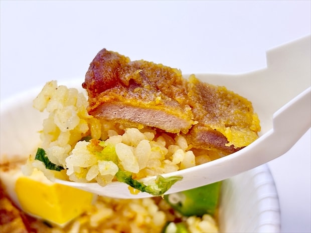 いただいてみると、思ったより五香粉は控えめで、スパイシーなカレーの風味が印象的。ホタテと椎茸の旨みが効いたレタス炒飯と相性抜群です。