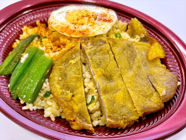台湾料理の定番である「排骨(パイコー)」を炒飯の上にのせた、ボリューミーな一品。排骨は、豚肩ロース肉に五香粉と調味料で1枚1枚下味をつけ、衣とカレー粉をまとわせてから揚げています。