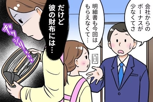 会社からのボーナスが少なく、財布に7.5万円余分に入っていたことにイライラ。信用できない彼がお金を使って旅立った。