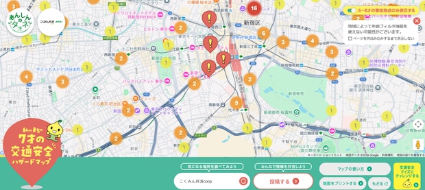 住所や学校名を入力するだけで、過去の交通事故情報や、危険箇所の投稿を確認できる「私のまちの7才の交通安全ハザードマップ」(画像提供:こくみん共済 coop )