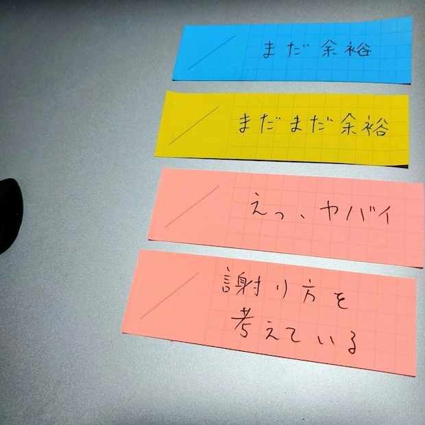 青・黄色・赤で色分けされた付箋には、それぞれ「余裕」「まだまだ余裕」など、心の声が書かれています。黄色から赤へと変わった途端、危機感が一気に上がるのがリアルですよね。タスクが多すぎて管理しきれない、あるいは手が回らない状態なのでしょうか。わかりみが深すぎる付箋です。