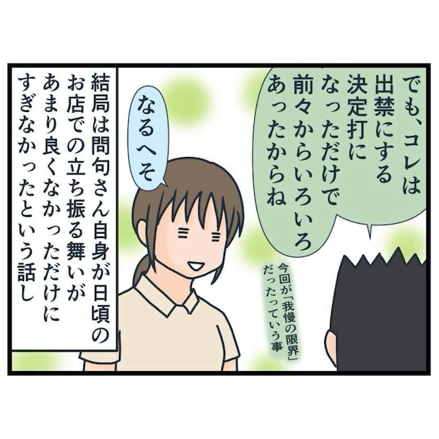 数日後に訪れた問句さんに、ついに出禁を言い渡します。納得のいかない問句さんは、店長に説明を求めました。