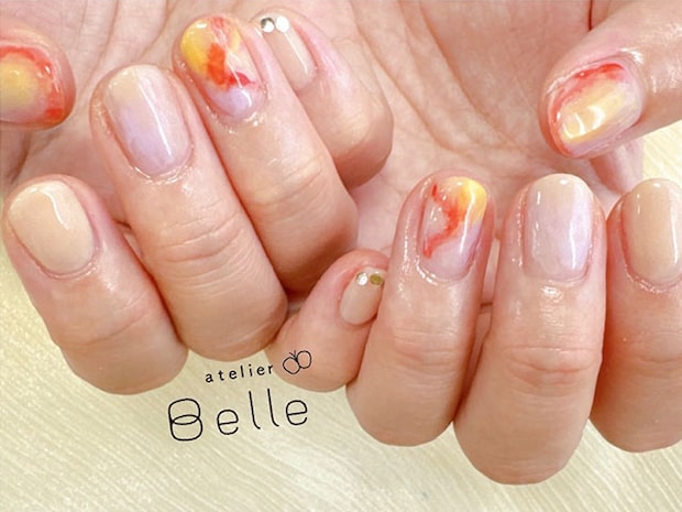 今回は、やわらかなベージュのネイルカラーをベースに、オレンジやイエローのネイルカラーを重ねて夕焼けのようなニュアンスを表現したネイルデザインをご紹介いたします。