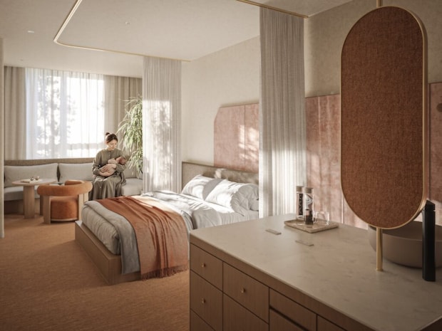 客室は「休むこと」を最優先に設計され、産後の身体に負担をかけにくいシモンズのベッドや、授乳や抱っこがしやすいレイアウト、産後の乱れがちな体内時計を優しく整える照明設計など、細部にまで工夫が施されています。