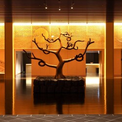 まず出迎えてくれたのが、約400年の歴史を持つ日本庭園に触れながら福岡県大川市の伝統工芸大川組子アートが施された豪華なメインロビー。庭園と建物が一体化した空間演出が素敵です。そして、エントランスから上層階へと続くエスカレーターが新設され、日本庭園の壮大さと繊細さを五感いっぱいに感じながら上っていけます。