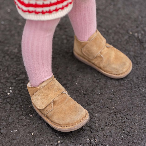 ピンクのリブタイツにキャメルのスエードシューズをオン! 春のお出かけにぴったりなカラーリングが可愛い♪
