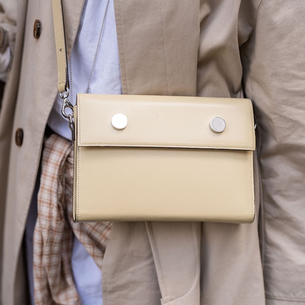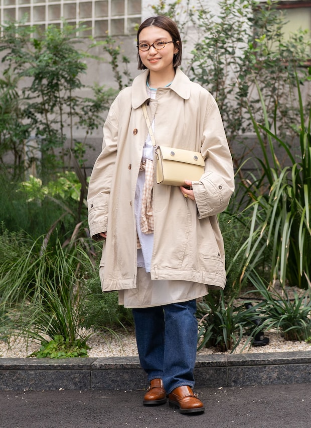 まるやかなベージュのショルダーバッグは『アールエスブイピー』のもの。シルバーのボタンディテールがモードなアクセント役に。