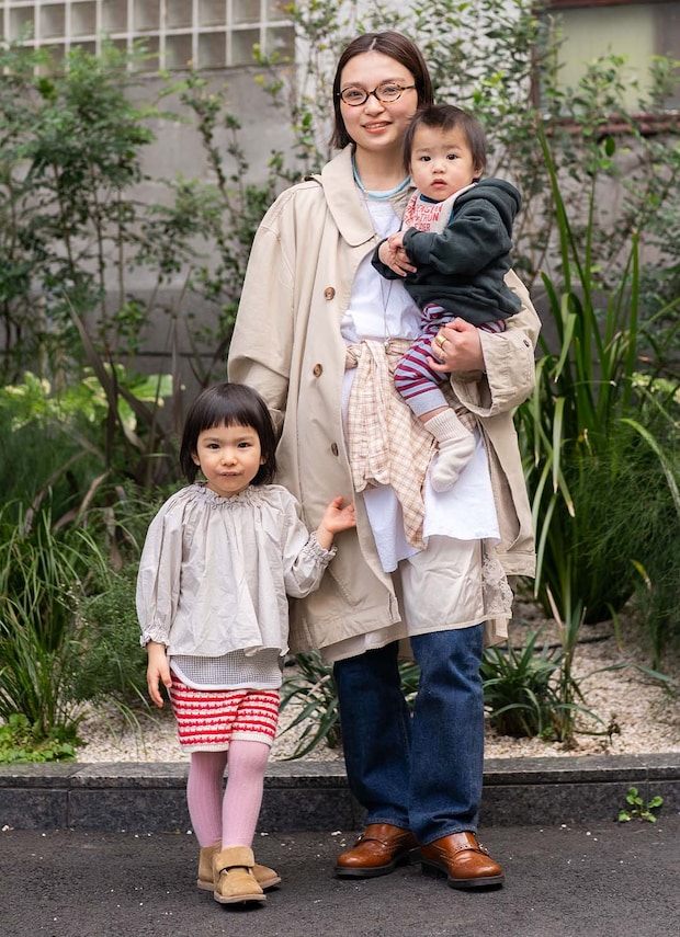 ボーダー柄をシェアしたキッズが、家族コーデの盛り上げ役に抜擢! 一方ママは春らしいベージュトーンでまとめ、小物で春カラーの挿して全体を引き締めたのがグッド♪