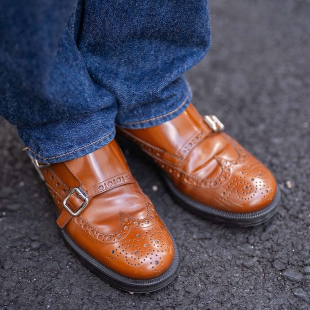 『ミュウミュウ』のシューズはウイングチップのディテールが目を引く逸品。インディゴのデニムとも好マッチなスタイリング。