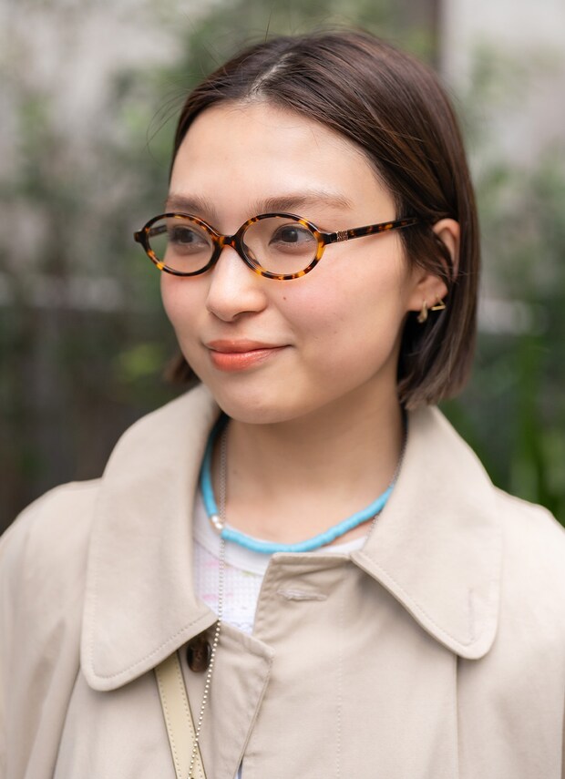 べっ甲フレームの『ミュウミュウ』のメガネは、レディなオーバル型をチョイス。ブルーのビーズネックレスで爽やかな春風を靡かせて♪