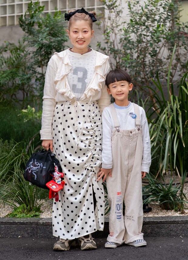 華やかなラッフルブラウスに、アシンメトリーなフリルギャザーがポイントのドット柄スカートを合わせたママ。といろくんは、サスペンダー付きの『ペイデイ』のボトムでお茶目に仕上げて。バッグやヘアアクセはブラックで揃えて、コーデ全体を引き締め。ちょっぴりボヘミアンなムードが漂う、軽やかで春らしい着こなしに脱帽♡