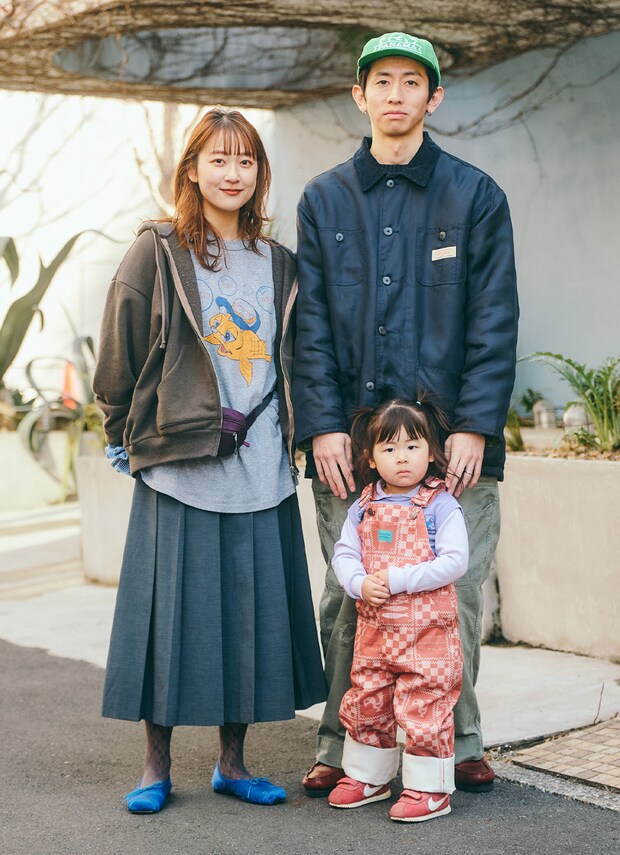 ママはフランダーのトップスでチャーミングに、せなちゃんは鳥や楽器が描かれた『フェイバリットピープル』のオーバーオールでチアフルな雰囲気に。パパはカジュアルな装いに、スポーティなグリーンのキャップをアクセントにプラス。肩の力を抜いたリラックス感のあるファミリーコーデが休日のお出かけにぴったり。