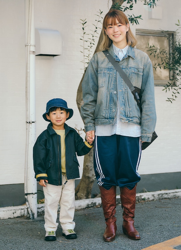 デニムを軸にしたストリートライクな親子コーデ。ママはラフさの中にもこなれ感のある着こなしで、ブーツが全体を引き締めた絶妙なバランスがポイント。つむぎくんはカジュアルな装いに『プチバトー』のデニムハットを添えて品のある印象に。デニムでさりげなくリンクさせ、自然体なムードをまとったスタイリング。