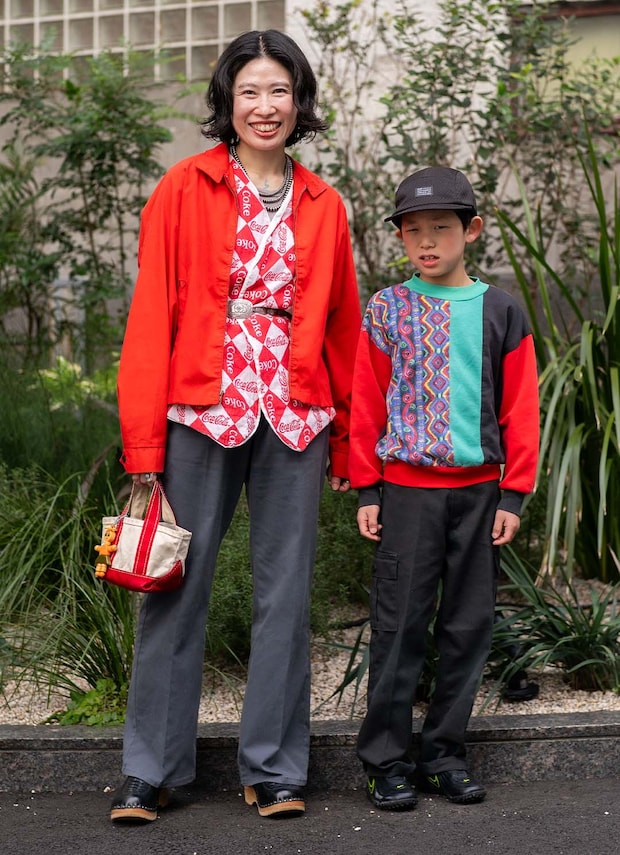 鮮やかな赤が2人を繋ぐカラーリンクがお見事! 遊び心たっぷりな「Coke」のロゴが目を引くジレに、鮮やかな赤アウターを羽織って、キャンバストートを添えたママ。皐月くんは、配色プリントのスウェットにキャップを合わせて大人っぽい雰囲気に。難易度の高い赤を取り入れ、さりげなくリンクさせた上級テクニック。