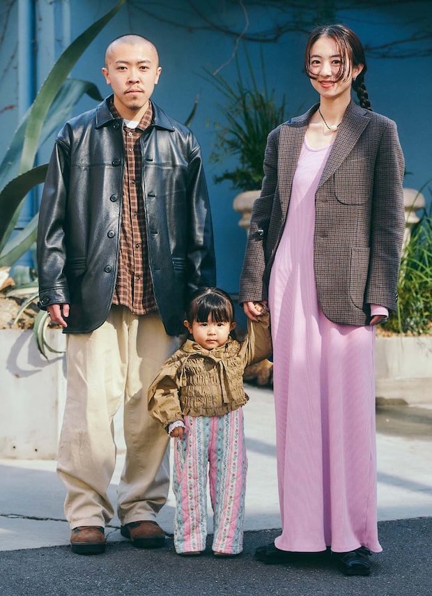 コーデがパッと明るくなるピンクのニットワンピを主役にしたママと、キルティングのお花柄オールインワンがとってもキュートなイオちゃん。レザーアウターやブラウンのシャツでシックにまとめたパパのスタイリングが、全体を程よく引き締めて、バランスの取れたファミリーコーデに。