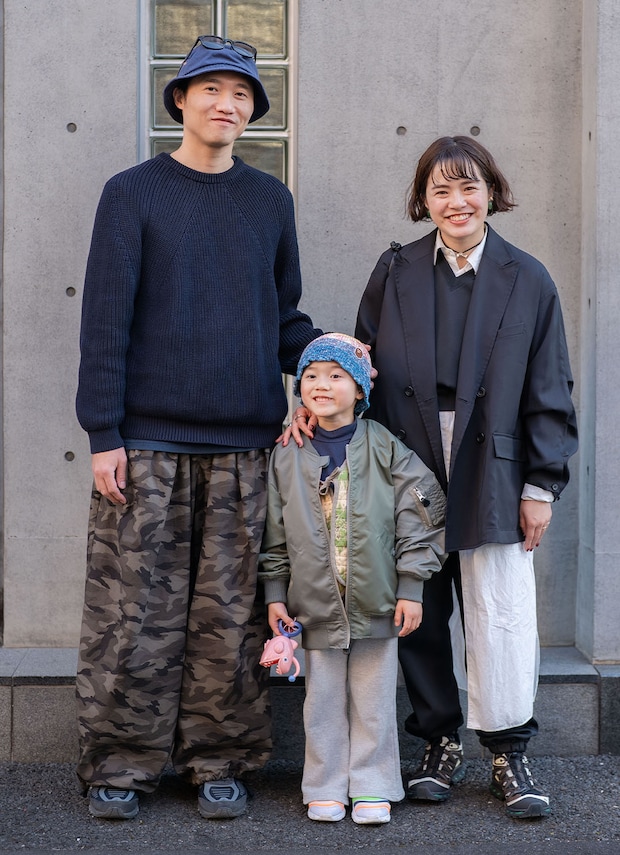 ほどよいカジュアルさと品の良さが交差する今成ファミリー。きちんと感のあるショートトレンチにラフなスウェットパンツを合わせてカジュアルダウンしたママ。オーバーサイズのMA-1にスウェットパンツを重ねたようたろうくん。ボリューミィな迷彩ボトムで存在感を放つパパ。3人の個性を引き立てたリラックスムードが魅力。