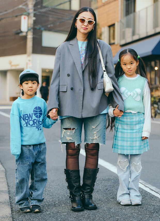 個性たっぷりなデニムを取り入れた親子コーデを披露してくれたayaさんファミリー。ママはクラッシュ感が魅力のジョーツを、uraちゃんはハートのパッチワークが可愛いデニムパンツを、gakkunくんはトレンドのカーゴ風デニムパンツをオン。トップスは淡いブルーで揃えることで、全体をやわらかくまとめているのもポイント。