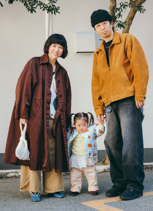 夫婦でブラウンアウターを着こなし、ヤエちゃんのお花柄アウターでアクセントをプラスしたファミリーコーデ。ママはきれいめにまとめつつ、ダメージ感のある『ウーア』のボトムでこなれた印象。パンツにスカートをレイヤードしたヤエちゃんの着こなしも、トレンド感たっぷりで目を引くポイント。