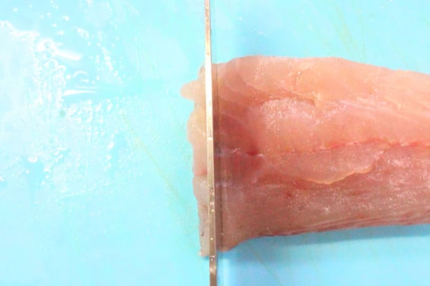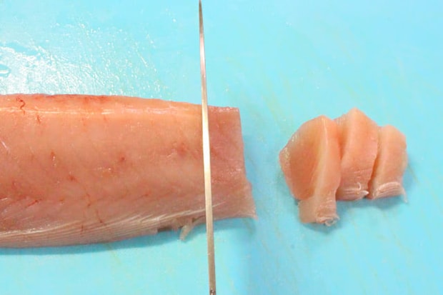 平造りにする場合はサクの右側から、サクに対して直角に包丁を入れます。今回は幅1cmくらいに切っていきます。