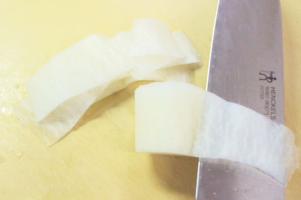 できるだけ薄くかつらむきにするのがポイントです。今回は大根を用意しましたが、きゅうりやにんじんでツマを作る時もかつらむきにします。