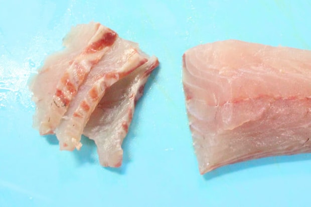 「そぎ造り」にしたスズキは模様がついている皮側の面が平らになっていて、分厚さを感じます。