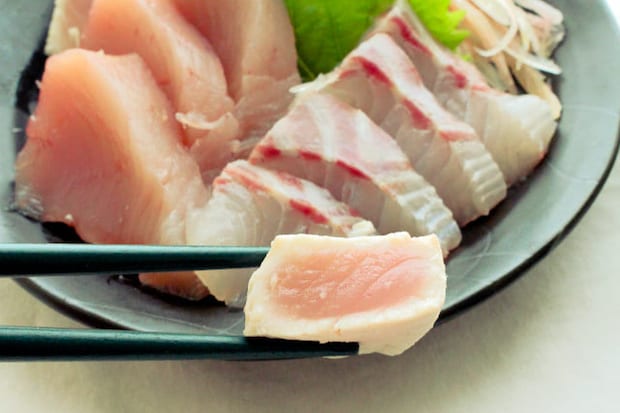 今回は、幅1.5cmほどの平造りにしたヨコワ3切れを40秒ほど茹でました。