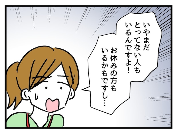 もらっていない人の分だけ返そうとするたまみに、「1人1個でしょ!」と注意する同僚。たまみはここでもまだ、あまりは全部自分がもらえると思っているようです。