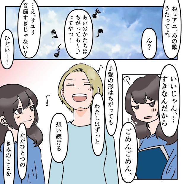 サユリと並んで歩いていると、「ねぇアユ、あの歌うたってよ」とリクエストされました。「ん?」と聞き返すと、おもむろに「あいのかたちはちがっても~ってやつ!」と、お世辞にも上手とは言えない歌声を披露するサユリ。思わず「え、サユリ音痴すぎじゃない?」とからかうと、「ひどい!いいじゃん好きなんだから」と頬をぷくっと膨らませました。