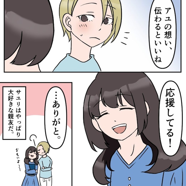サユリは私に優しく微笑むと「アユの想い伝わるといいね、応援してる!」と言ってくれました。色気も可愛げもない私に好きな人がいるなんて、普通なら笑われてもおかしくない話です。それでもサユリは、からかったり否定したりすることなく、まっすぐに私の恋を応援してくれました。やっぱりサユリは、私の大好きな親友です。