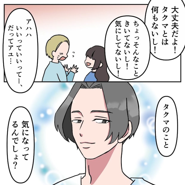 サユリは、私がタクマさんに気があることを察したのか、「大丈夫だよ!タクマとは何もないし!」と言いました。私は思わず顔が熱くなり、「ちょっ、そんなこと聞いてないし!気にしてないし!」と慌てて否定します。するとサユリは優しく微笑みながら「いいっていいって、だってアユ・・・タクマのこと気になってるんでしょ?」と問いかけてきました。