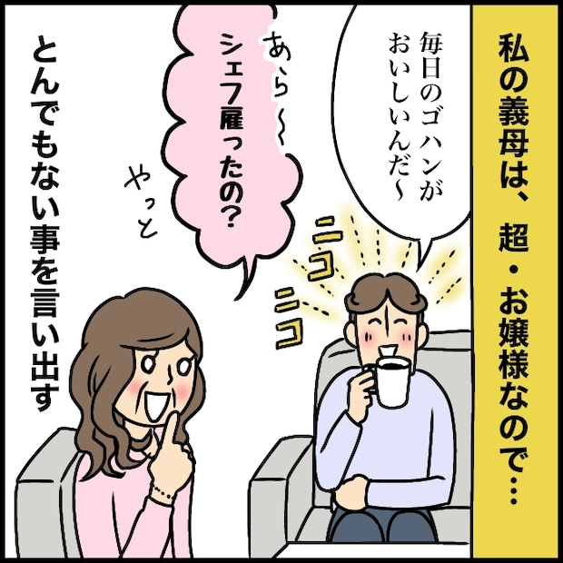 お嬢様育ちの義母の言動は浮世離れしています。この日も我が家に遊びに来てくれた義母に夫が「毎日のごはんが美味しいんだ~」と私の料理を褒めてくれているのを聞いて、「あら~、やっとシェフ雇ったの?」と、さらりととんでもないことを言いだします。もちろん悪気なんてこれっぽっちもありません。