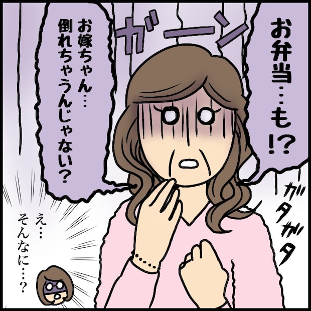 義母は青ざめて「お弁当・・・も!?」と繰り返しました。え、そんなにショック受ける?そう思っていると「お嫁ちゃん、倒れちゃうんじゃない?」と震えた声で義母が言うので、いったいどんなお弁当を想像しているのだろうとむしろ興味がわきました。まさか3段の桐の重箱の立派なお弁当を想像していたりして。クスっと笑いそうになったその時。