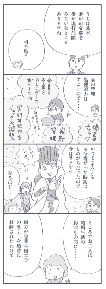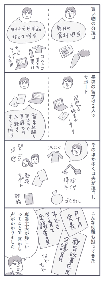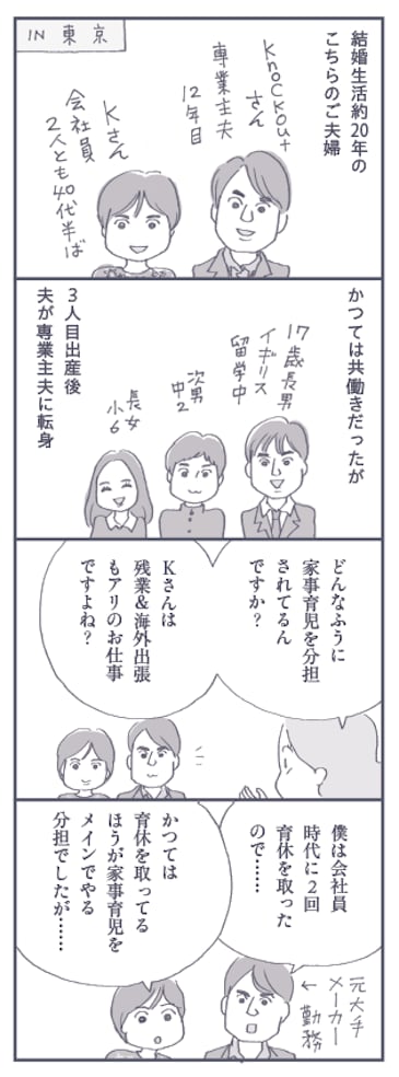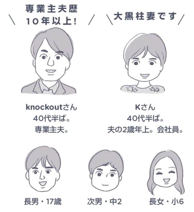 大学のサークルで出会い、2002年に結婚。夫が妻の姓になる。結婚当初、夫は大手メーカー勤務の共働きで、順番に長期育休を取得(部署初の男性育休取得者)。第3子誕生後に夫が専業主夫に。結果的に「子どもの成長過程を間近で見るのが好きだから向いていた」と語る。長男は英国留学中。夫はknockout名義で教育などについて発信中。