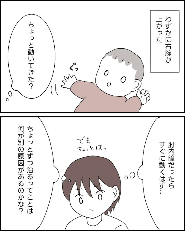 この日、ぷくちゃんの右腕が少し動いていました。しかし、最初の医師からは「肘内障」が治ればすぐに動くと言われていたので、治ったとは思えませんでした。