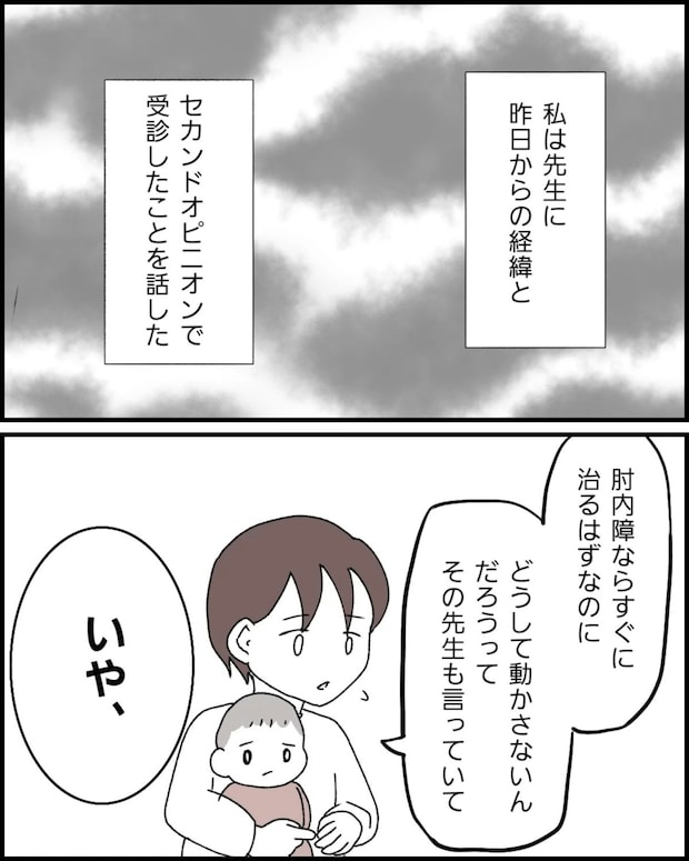 そこでセカンドオピニオンとして別の整形外科を受診することに。診断は同じく「肘内障」でしたが説明や対応は最初の医師とはまったく異なり、その丁寧さに大きな衝撃を受けたといいます。処置自体は間違っていなかったものの、医師による対応の違いになっぽさんは考えさせられました。