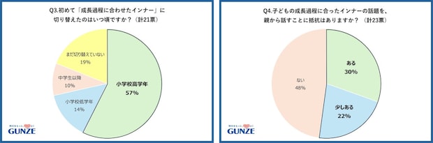切り替え時期としては「小学校高学年」が57%で最多となった一方、インナーについて子どもと話すことに抵抗がある人も半数を占める結果となりました。