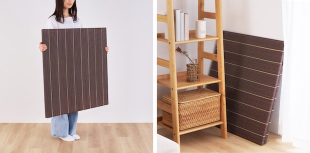 82×82cmのサイズで、女性一人でも軽々と持ち運べる重さ。裏面には滑り止め加工を施しており、フローリングに置くだけで設置完了。使わないときは立て掛けて収納することも可能です。