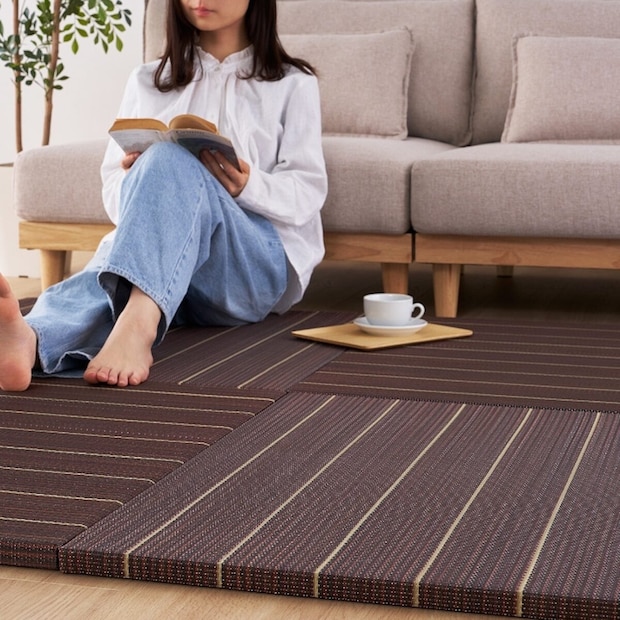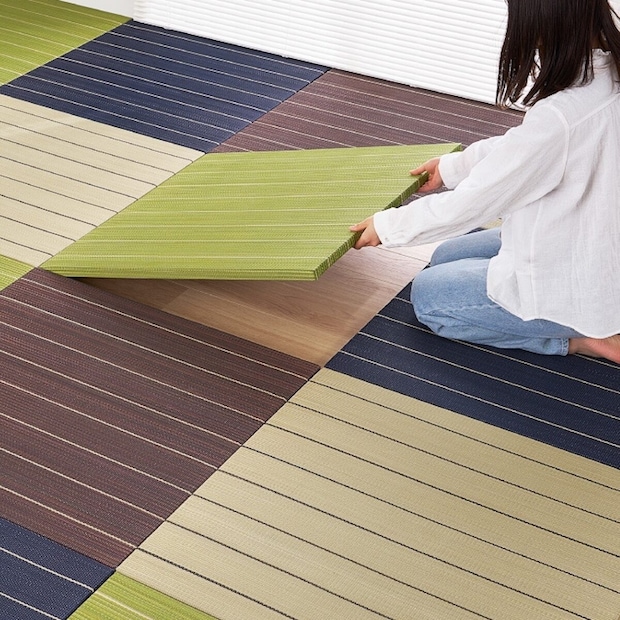 い草の心地よい質感はそのままに、独自のストライプ柄でスタイリッシュな雰囲気に仕上げました。カラーはナチュラル、ブラウン、グリーン、ブラックの4色展開。単色使いはもちろん、複数色を組み合わせることで、部屋に遊び心をプラスできます。
