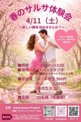 松山市で開催されるサルサダンス体験イベント。初心者でも安心して参加でき、基本ステップやペアワークを楽しく学べます。ラテンの陽気な音楽に合わせて体を動かし、リフレッシュできる内容。愛媛の週末イベントとして、気軽に新しい趣味を始めたい方にもおすすめです。