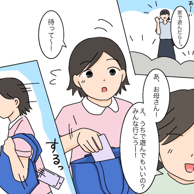 シール交換で盛り上がっていると、たかこちゃんのお母さんが「おーい、家で遊んだら?」と子どもたちを呼びに来ました。「え、うちで遊んでもいいの?みんな行こう」そのひと言を合図に、友達はぞろぞろと家のほうへ向かいます。あいも慌てて後を追いましたが、その拍子に新作のうるうるシールがカバンからするりと落ちてしまいました。