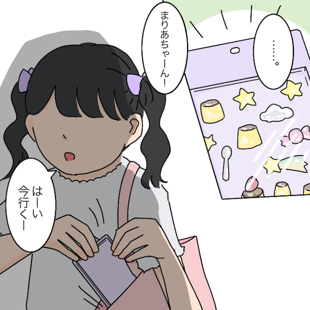 その場で考え込んだあと、まりあちゃんはあいに声をかけることなく、新作のうるうるシールをそっと自分のカバンにしまったのでした。